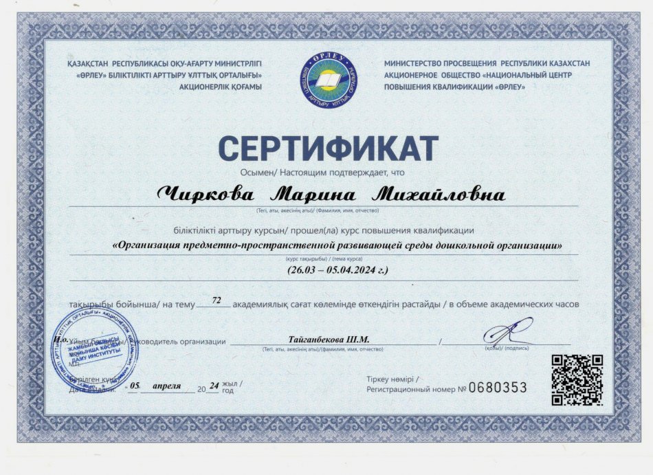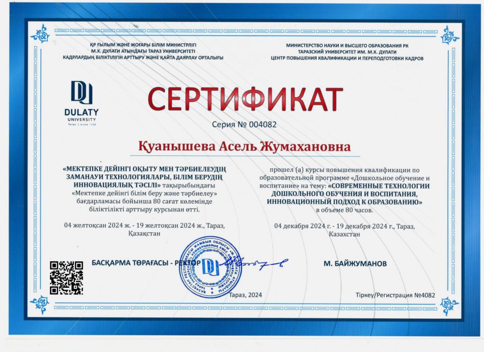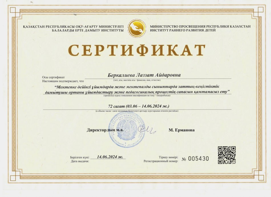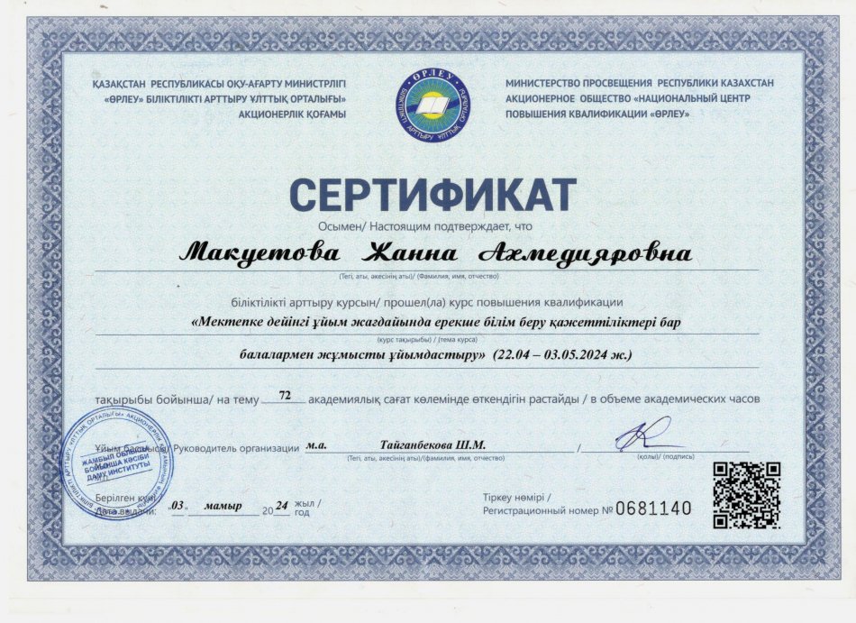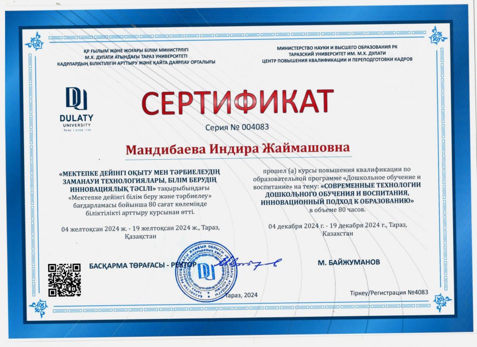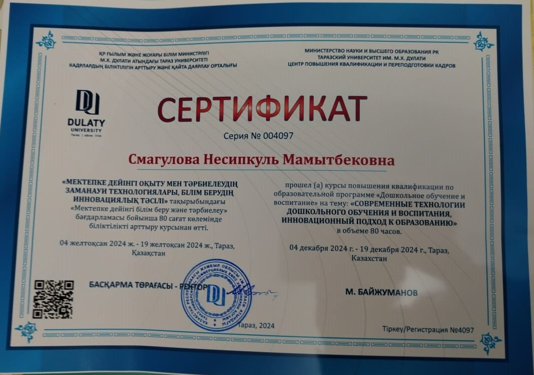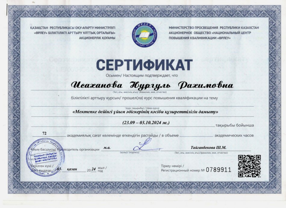 31 желтоқсан 2024 2024 жылдағы біліктілік арттыру курсынан өткен педагогтердің сертификаттары Осы беттің QR-коды:QR-код этой страницы: