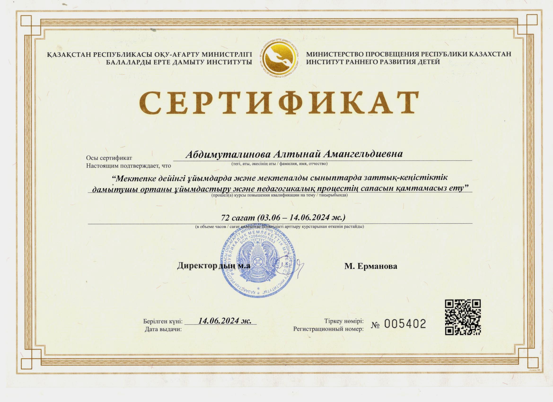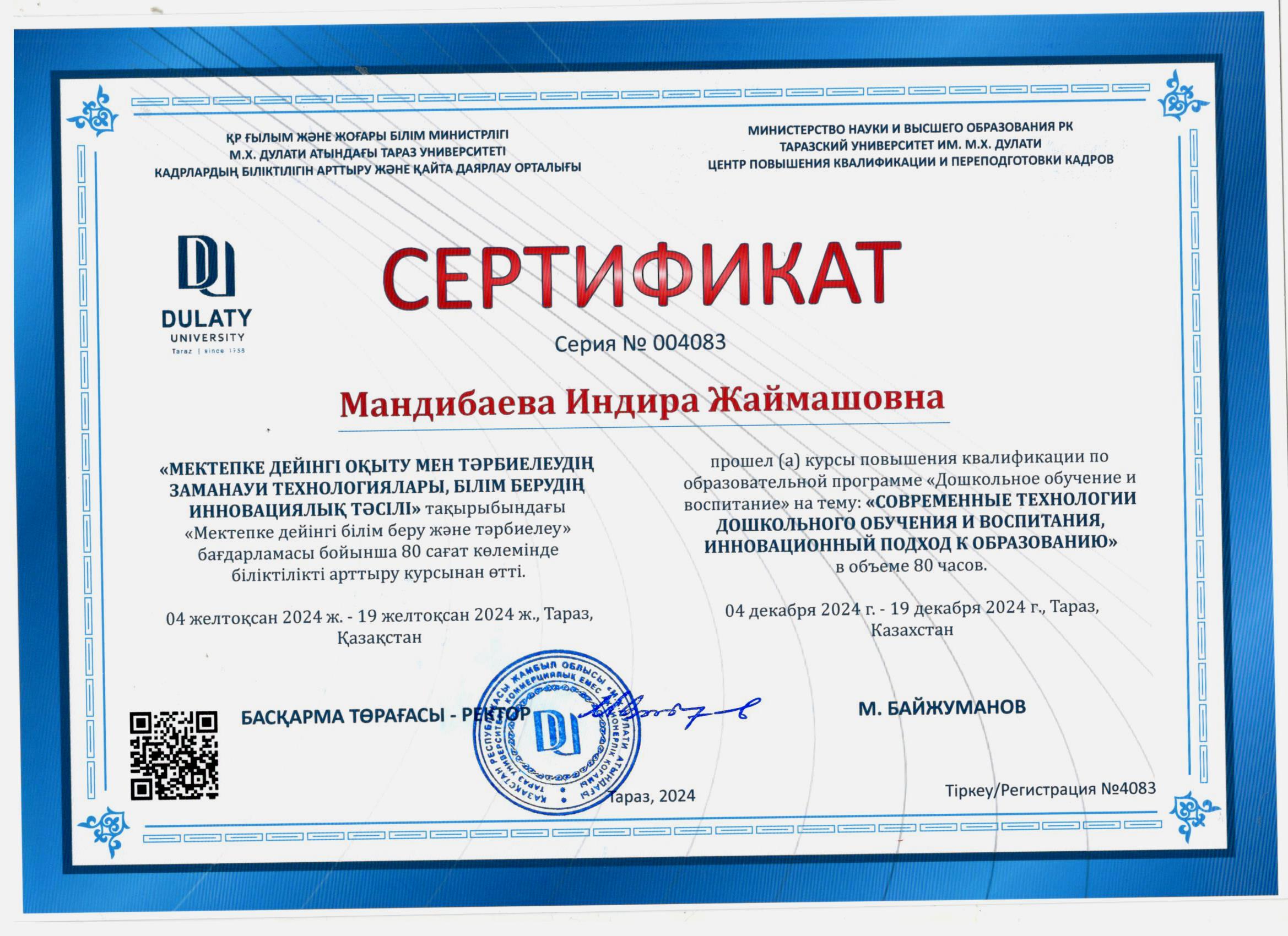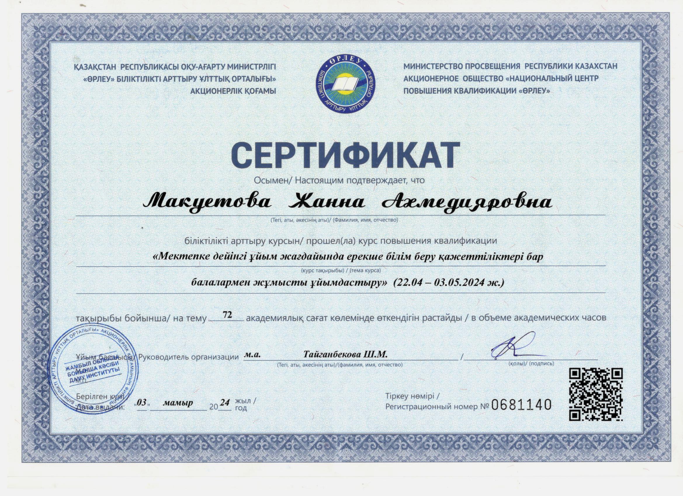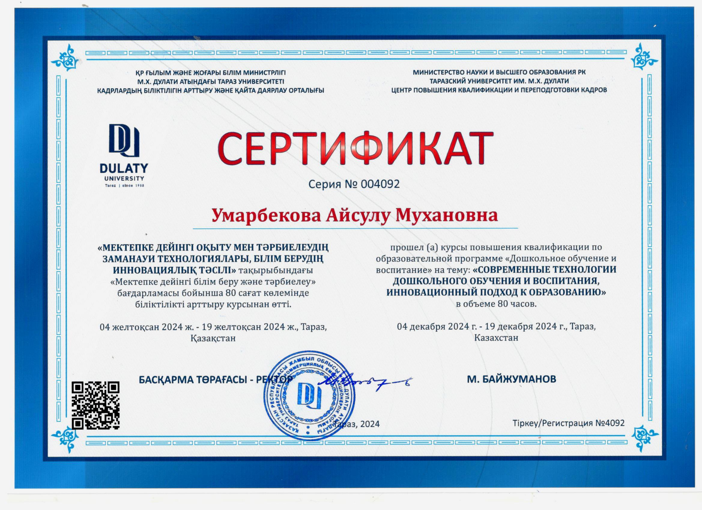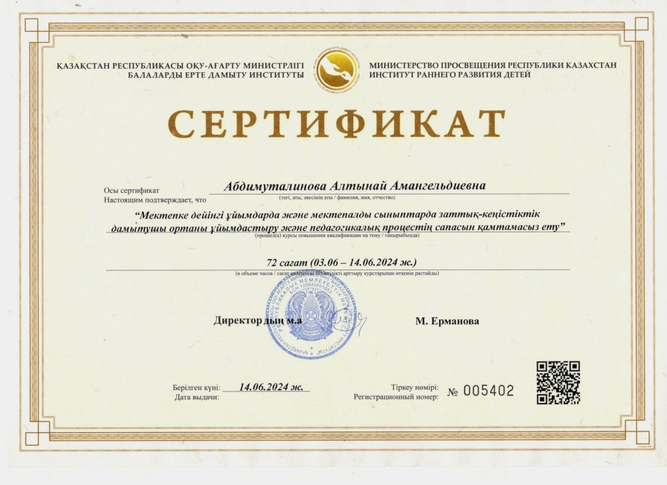 31 желтоқсан 2024 2024 жылдағы біліктілік арттыру курсынан өткен педагогтердің сертификаттары Осы беттің QR-коды:QR-код этой страницы: