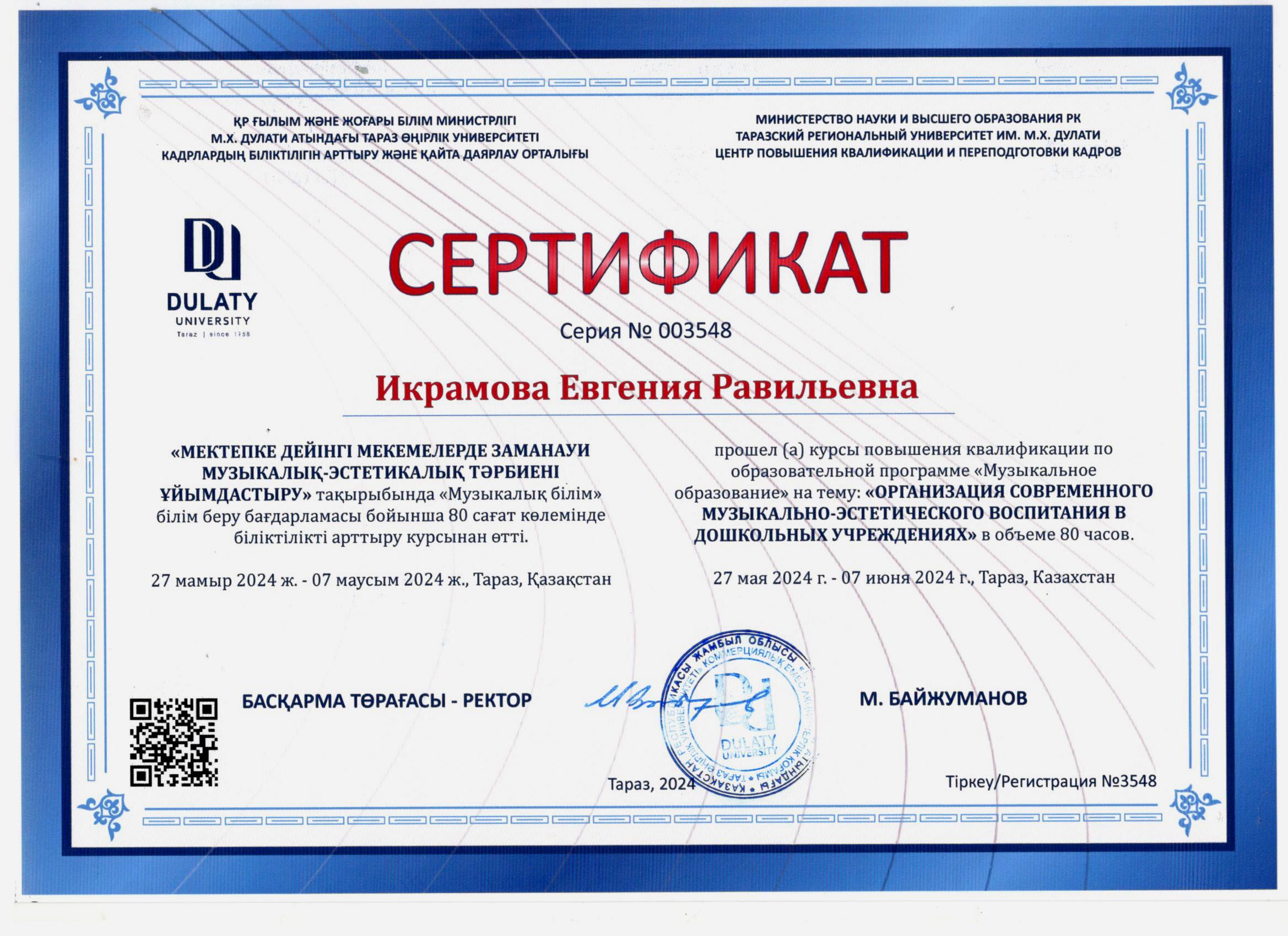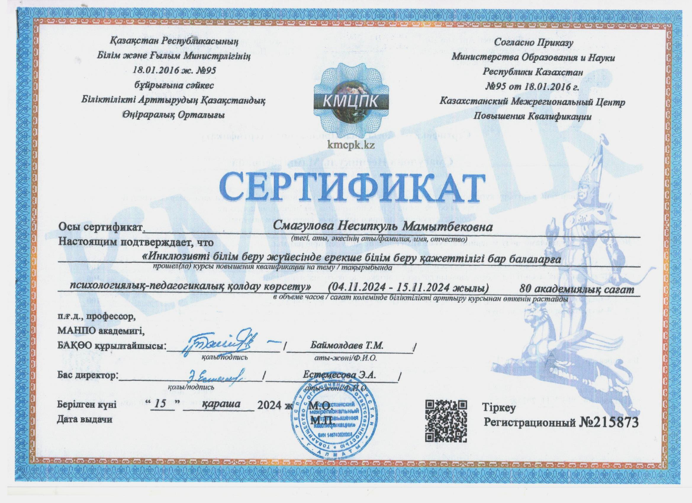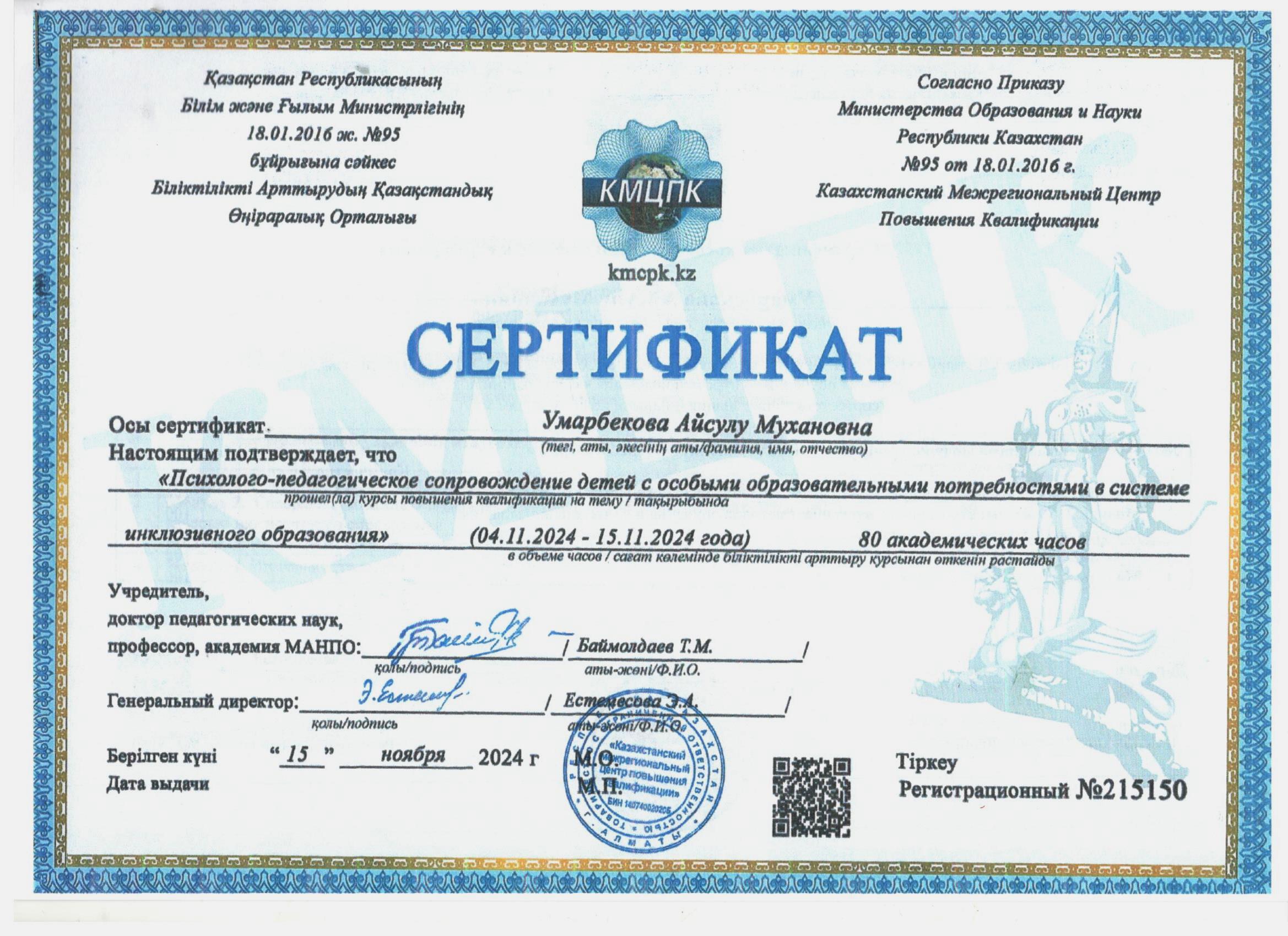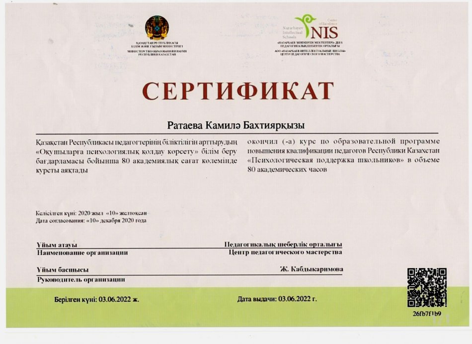 31 желтоқсан 2024 2024 жылдағы біліктілік арттыру курсынан өткен педагогтердің сертификаттары Осы беттің QR-коды:QR-код этой страницы:
