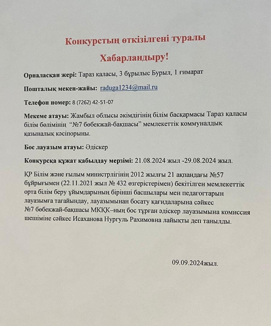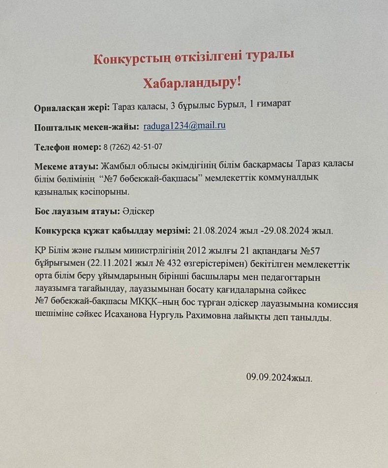 Педагогтарын жұмысқа қабылдау » №7 бөбекжай-бақшасы