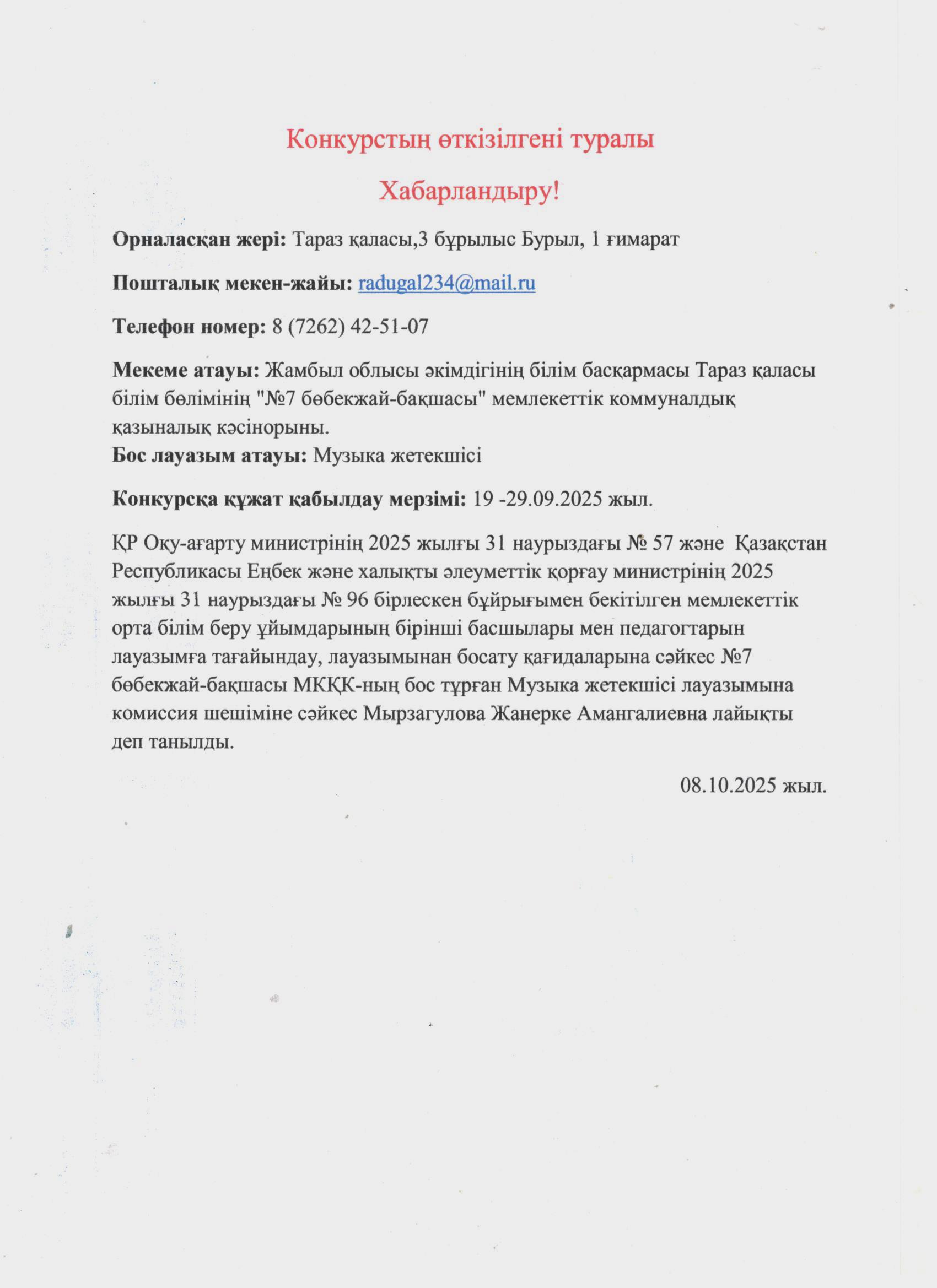 Конкурстың өткізілгені туралы хабарландыру! » №7 бөбекжай-бақшасы